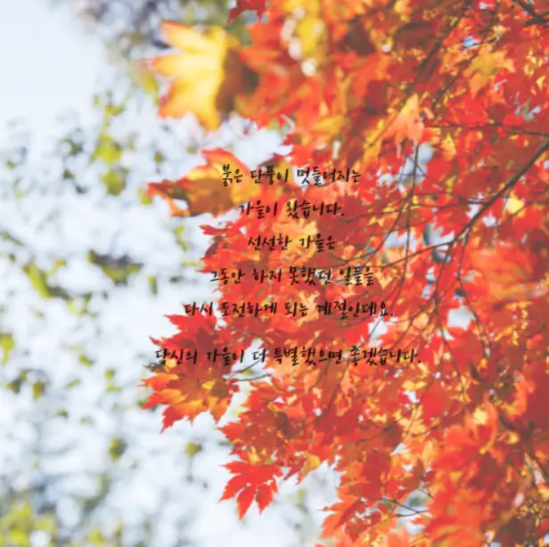 가을 단풍처럼 아름다운 하루 되세요! 알록달록 물든 단풍잎처럼 아름다운 하루를 만들어 보세요. 오늘 하루도 당신의 삶에 아름다운 추억이 가득하기를 바랍니다.