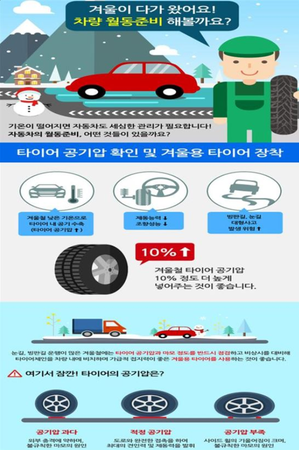 겨울철 안전운행을 위해 타이어 공기압은 평소보다 더욱 철저하게 관리해야 하는데요. 공기가 수축하는 현상을 미리 보정하기 위해 평소 권장치보다 약간 더 주입하는 것이 전문가들의 공통된 권고입니다.