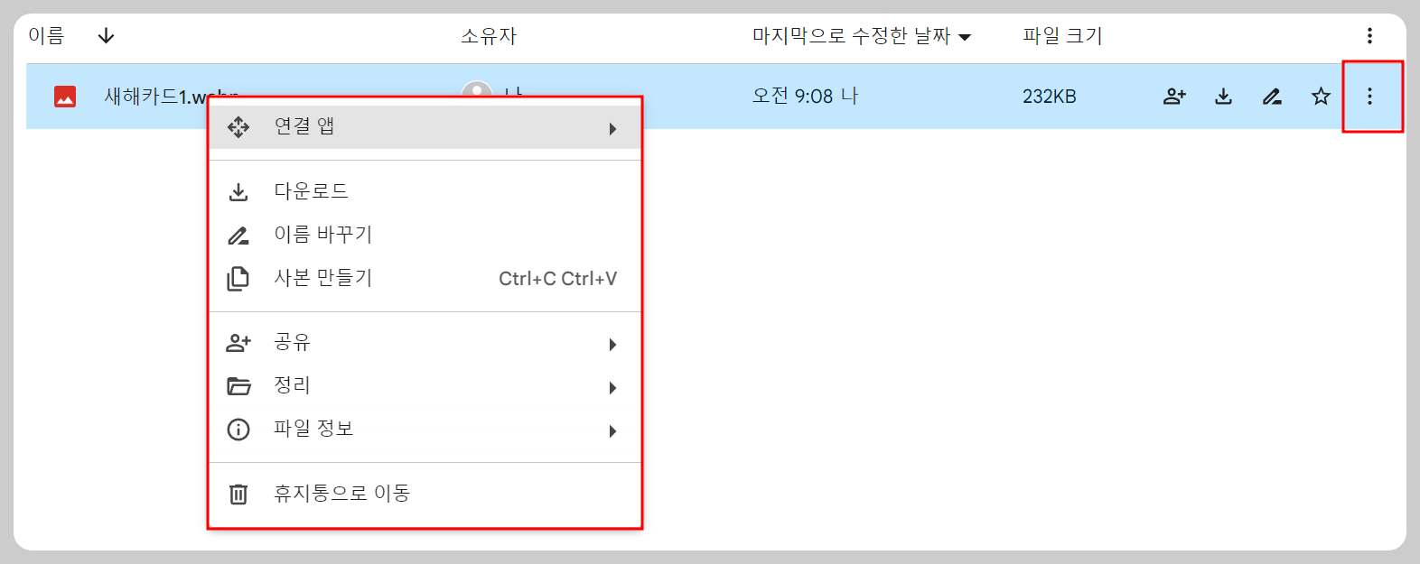 공유설정하는 창을 화면에 띄우는 방법은 2가지예요. 먼저 마우스를 새해카드 1에 있는 곳으로 이동한 후 마우스 오른쪽 클릭을 하면 화면과 같이 "연결 앱 등등" 설정창이 화면에 나타납니다. 두 번째 방법은 맨 오른쪽에 점 3개 보이시나요? 누르면 똑같은 설정창이 나오게 돼요. 나오시죠?