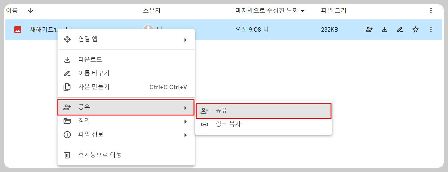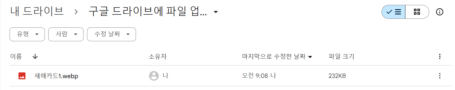 전 바탕화면에 있는 새해카드 1을 예시로 올려 보았는데 바로 이렇게 화면구성이 바뀌면서 파일이 업로드된 거예요. 참 쉽죠? 이제 아래에서 공유하는 방법 알아볼게요. 공유는 더 쉽게 금방 끝나요.