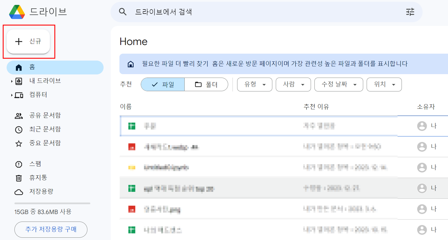 전 이것저것 사용하고 있어서 모자이크 처리 했습니다. 신규 버튼을 누르시면 바로 이렇게 새 폴더가 나오게 됩니다. 눌러주세요.