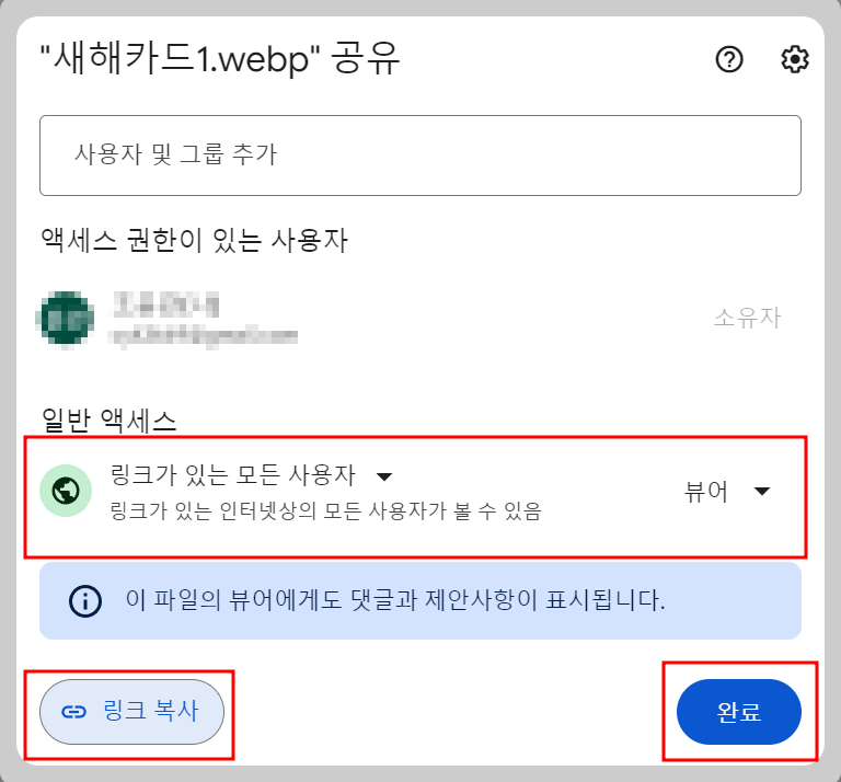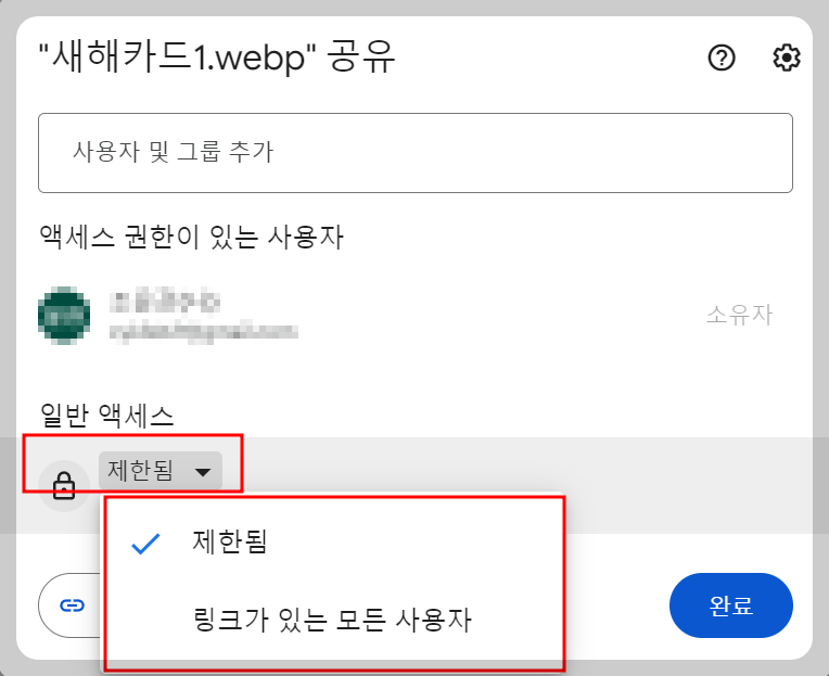 그럼 아래 공유 버튼을 누르시면 바로 옆에 똑같이 공유와 링크복사라는 게 나오게 됩니다. 링크복사 위쪽에 있는 공유를 눌러주세요. 그럼 아래와 같은 화면이 중앙에 나타납니다. 제 이름은 가리고 제한됨이라고 보이시죠?