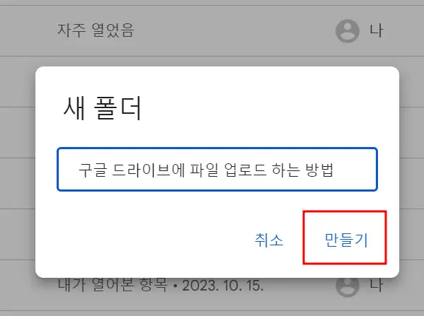 새 폴더니까 이름을 정해 주어야겠죠? 전 구글 드라이브에 파일 업로드 하는 방법이라고 이름을 넣어줬어요. 하고 싶은 이름 적어주시고 만들기 눌러주세요.