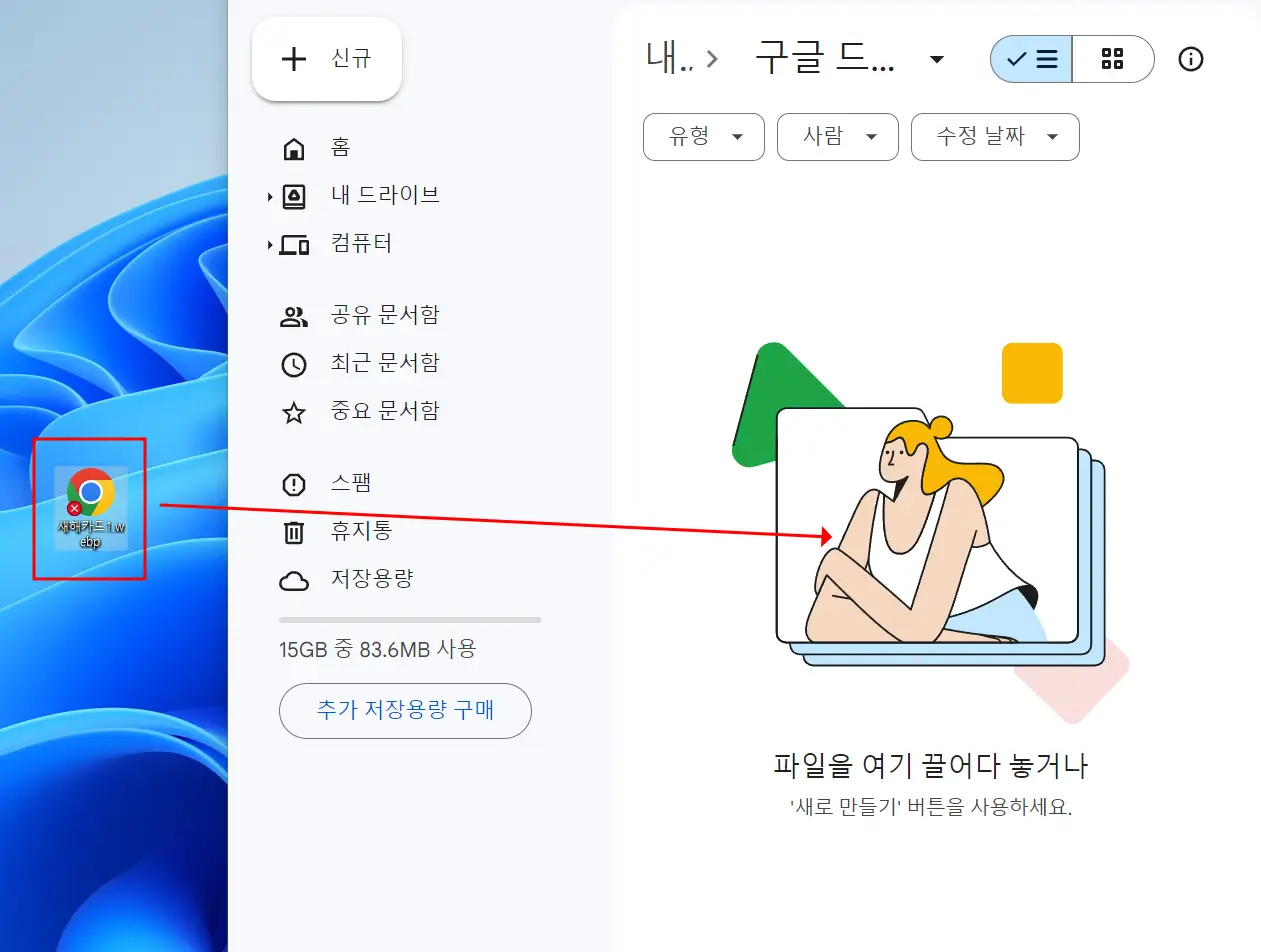 이제 파일 업로드 하는 최종인데요. 구글 드라이브에 올리고 싶은 파일을 끌어다가 놓으시면 됩니다. 힘들게 폴더 안을 찾아가는 방법보다 내가 넣고 싶은 자료를 바탕화면에 끌어다 놓고 다시 구글 드라이브에 넣으면 파일 업로드가 쉽게 되죠.
