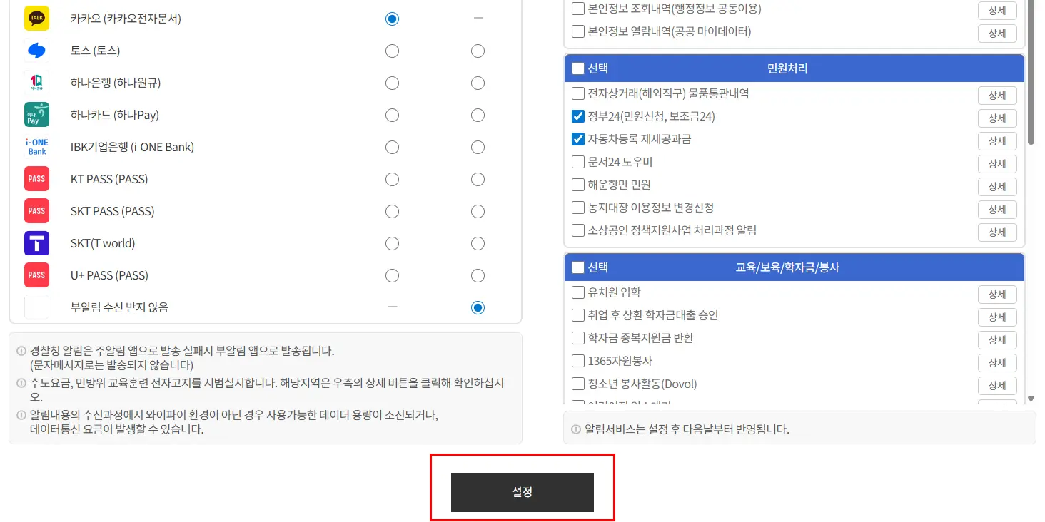 한번 읽어 보시고 내가 알림을 받았으면 하는 항목에 체크만 하시면 됩니다. 다 하셨으면 아래 설정을 눌러만 주시면 끝이에요. 정말 간단하죠?