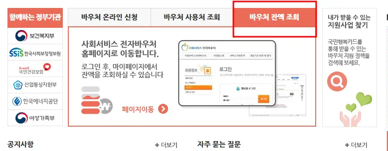 바우처 온라인 신청/ 바우처 사용처 조회 / 바우처 잔액 조회가 있는데 잔액 조회로 들어가셔서 로그인 후 마이 페이지를 누르시면 사용 후 잔액이 나와있습니다.