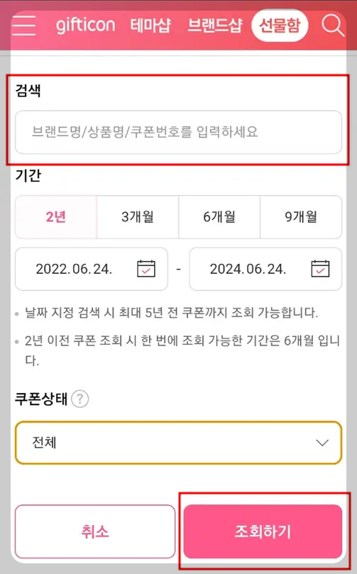 상세조회를 누르고 위에 보이면 검색에 브랜드명과 상품명, 쿠폰번호를 적고 조회하기 누르면 사용여부를 확인할 수 있습니다.