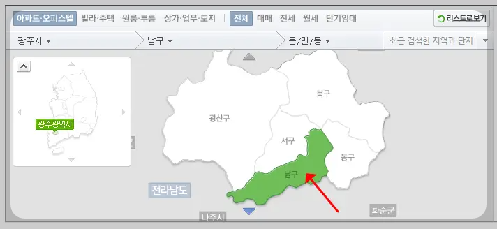 전 광주에 남구를 선택해 보았어요. 가격이 나간다는 이야기를 듣고 봉선동에 있는 아델리움을 한번 확인해 볼게요. 아래 빨간색 테두리에 "아파트", "오피스텔" 등을 설정할 수 있어요. 거래방식과 면적, 가격대로 볼 수도 있으니 설정해 보세요.