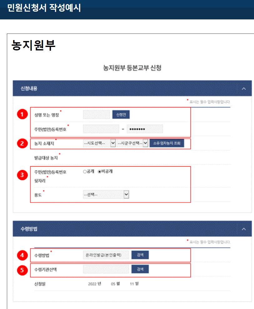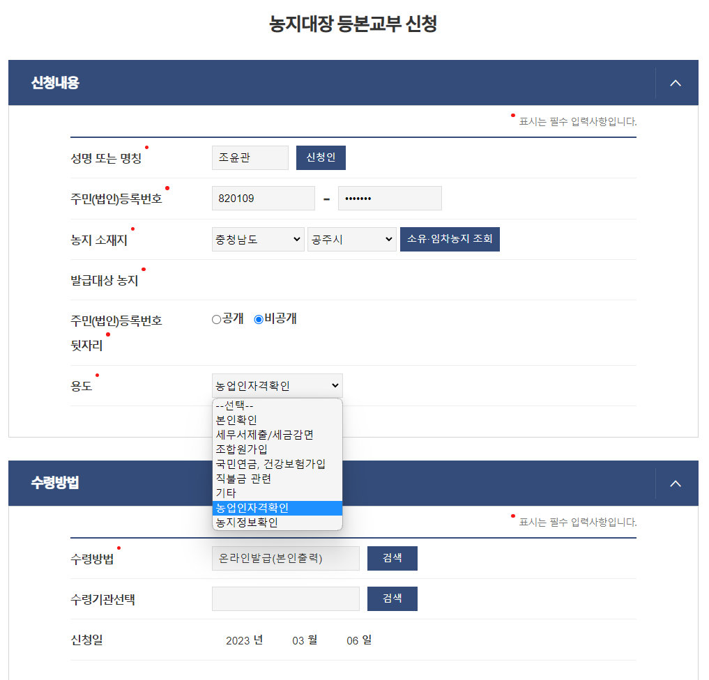 성함, 주민번호, 농지 소재지는 쉬운데 용도에서 헷갈리는 분들이 계세요.