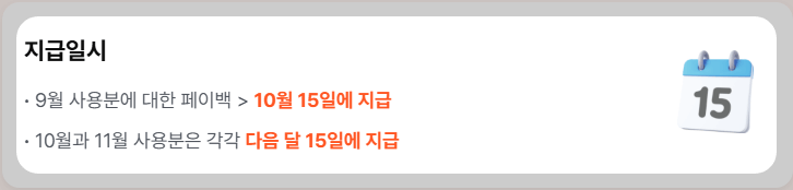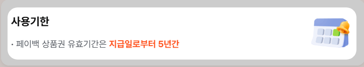 9월 사용분은 10월 15일에 지급하는데요. 한달 후에 받을 수 있습니다. 페이백 상품권 유효기간은 5년간 쓸 수 있게 넉넉하게 사용기한을 잡아왔어요.