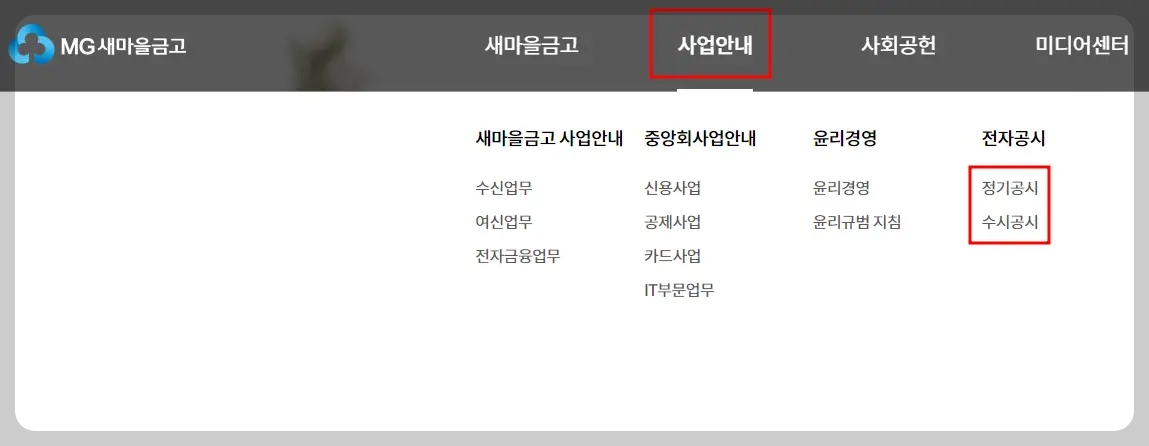 사업안내에 전자공시 밑에 보시면 정기공시라고 보이실 거예요. 정기공시를 눌러주세요.