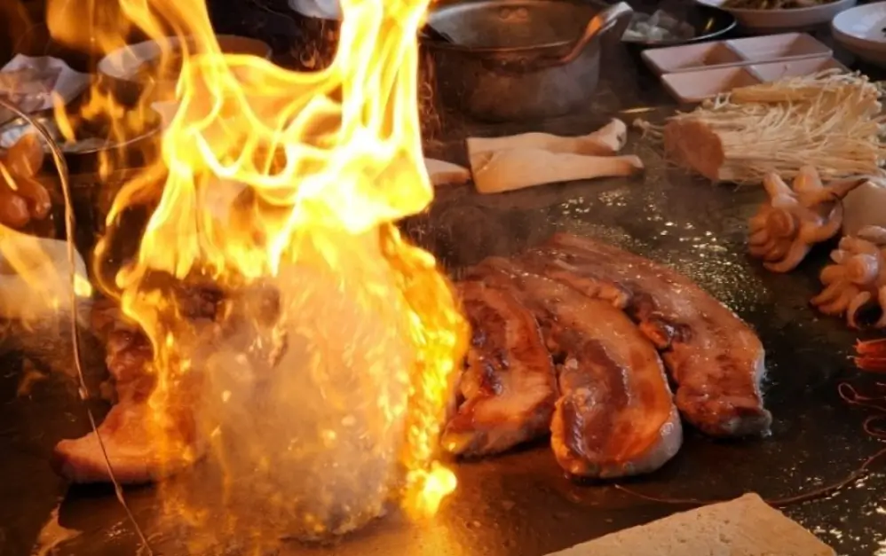 불쇼도 보고 직원분들이 직접 구워주고 손질까지 해주는 우미관 철판구이예요.