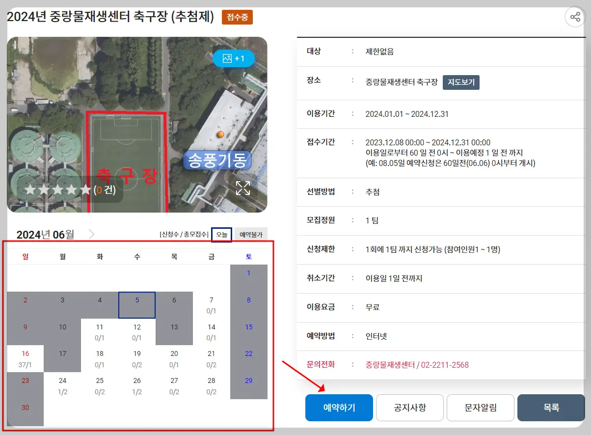 체육시설에 축구장을 누르고 축구장 왼쪽을 바로 누르시면 현재 빌려서 쓸 수 있는 축구장이 나오게 됩니다. 전 중랑물재생센터 축구장을 선택해 볼게요. 그리고 바로 옆에 있는 예약하기를 누르세요.