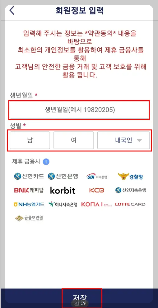 설치도 거의 끝나갑니다. 마지막으로 생년월일과 남, 여 선택, 내국인 및 외국인 선택 하시면 가입이 완료가 돼요.