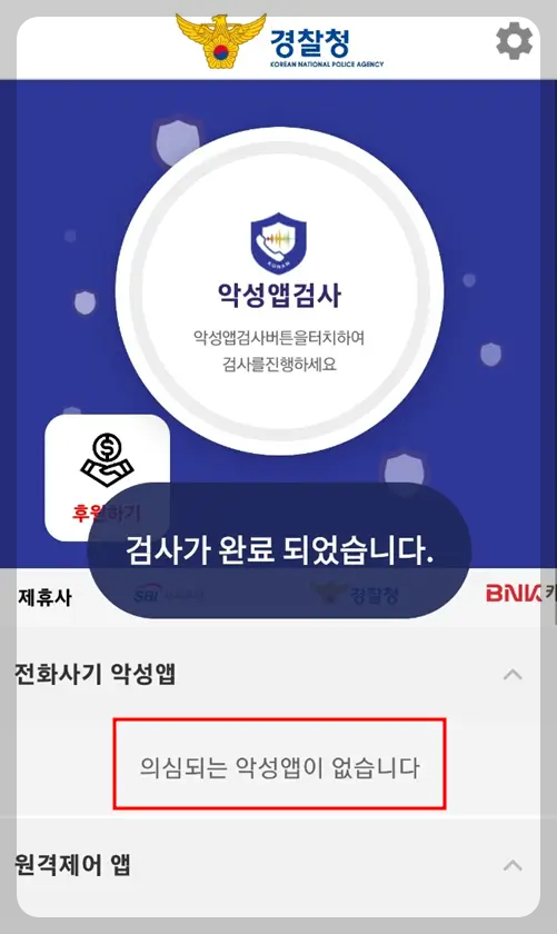 '악성앱검사'를 누르시면 동그라미가 한 바퀴 돌아가며 검사를 하게 되는데요. 검사가 완료되면 아래와 같은 '검사가 완료되었습니다.' 화면이 나와요. 그리고 아래 확인해 보시면 의심되는 악성앱이 없다는 메시지가 나오게 된다면 안심하셔도 됩니다.