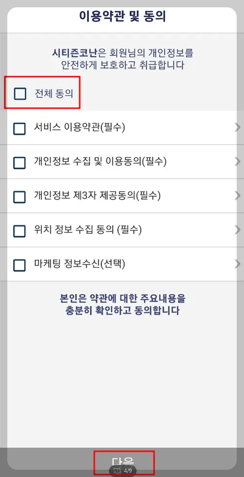 이제 '이용약관 및 동의'가 나오는데요. 전체 동의 누르시면 됩니다. '필수' 항목은 다 체크하셔야 하고 아래 '선택' 항목은 체크 안 하고 싶으면 안 하셔도 됩니다.