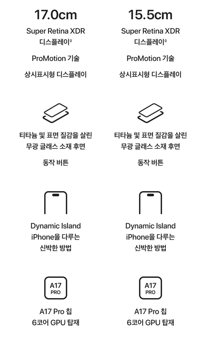 우선 15프로와 15프로 맥스의 같은 점은 티타늄 및 표면 질감을 살린 무광클래스 후면이 같아요. 동작버튼 및 A17 Pro칩 6 코어 GPU탑재를 했고요. 프로급 카마레 시스템인 48MP메인, 울트라 와이드, 초고해상도 사진도 같은 점입니다. UBS-C타입 충전방식과 얼굴인식 ID, 초고속 5G 셀룰러 또한 같습니다. 아래 차이점을 제외하고는 거의 다 같다고 보시면 됩니다.