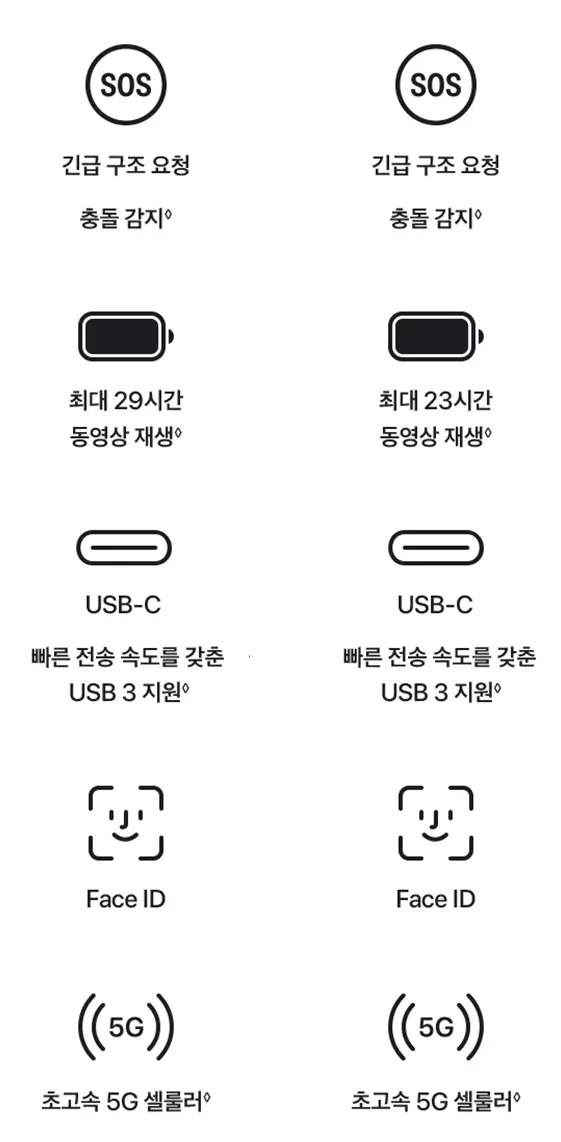 차이점은 첫 번째로 디스플레이가 15프로는 15.5cm이고 프로맥스는 17cm입니다. 화면크기는 눈에 띄는 차이니 쉽게 확인해 보실 수가 있고요. 두 번째로는 15프로가 동영상 최대 재생시간이 23시간이며 15프로 맥스는 최대 29시간입니다. 세 번째는 역시 무게차이죠. 15프로는 187g으로 가벼워졌습니다. 15프로 맥스는 221g입니다.