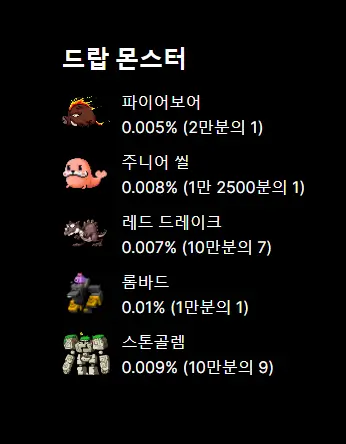 아이템을 드랍하는 몬스터도 확인할 수 있으며 드랍 확률까지 확인할 수 있어서 어떤 몬스터를 잡아야 할지 쉽게 결정할 수 있습니다.