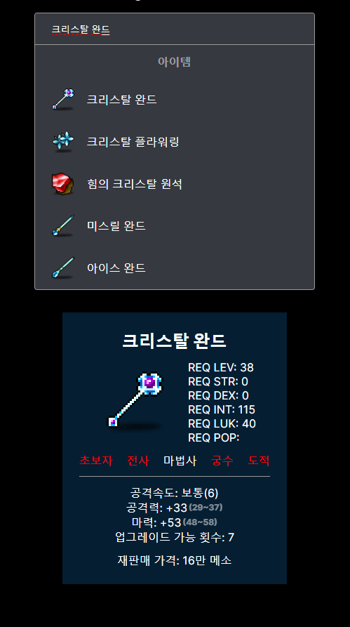 어머지지 사이트는 원하는 아이템을 검색하면 아래와 같이 착용하는 직업계열과 아이템 공격력, 공격속도, 마력, 업그레이드 가능수와 재판매 가격을 알 수 있습니다.