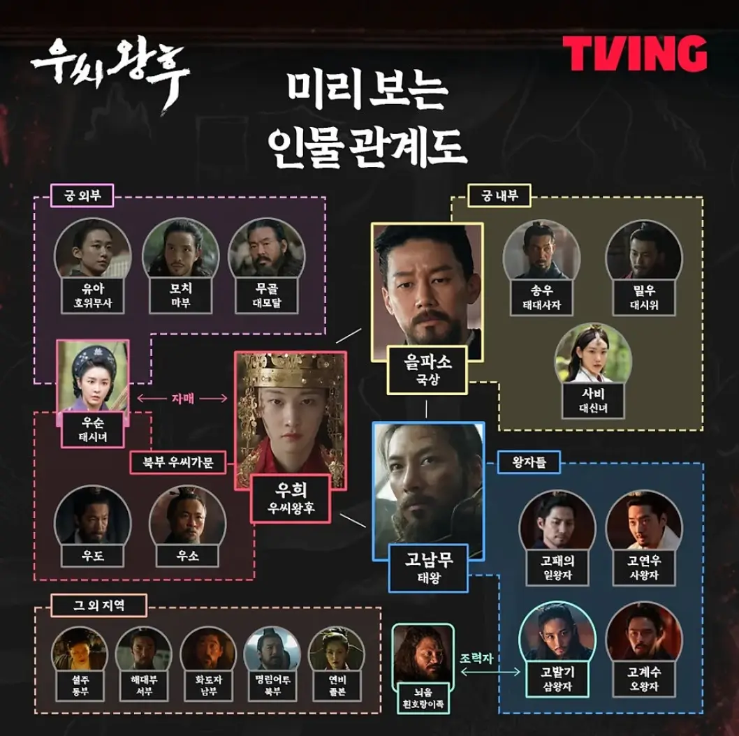2024년 8월 29일, 티빙에서 공개된 퓨전 사극 '우씨왕후'는 화려한 캐스팅과 흥미로운 스토리로 많은 관심을 받고 있는데요. 갑작스러운 왕의 죽음으로 인해 왕위를 둘러싼 암투에 휘말린 우씨왕후의 이야기를 액션과 스릴러로 버무려 독특한 볼거리를 제공하는데요. 시청등급이 18세 이상으로 청불이라 가족들과 함께 보기 민망한 부분들이 있습니다. 우씨왕후 등장인물과 인물관계도에 대해 알아보아요.