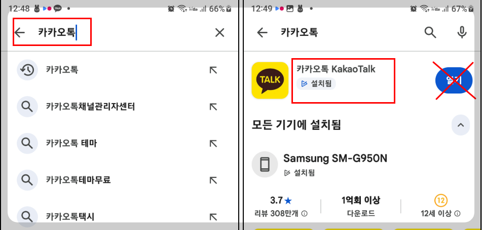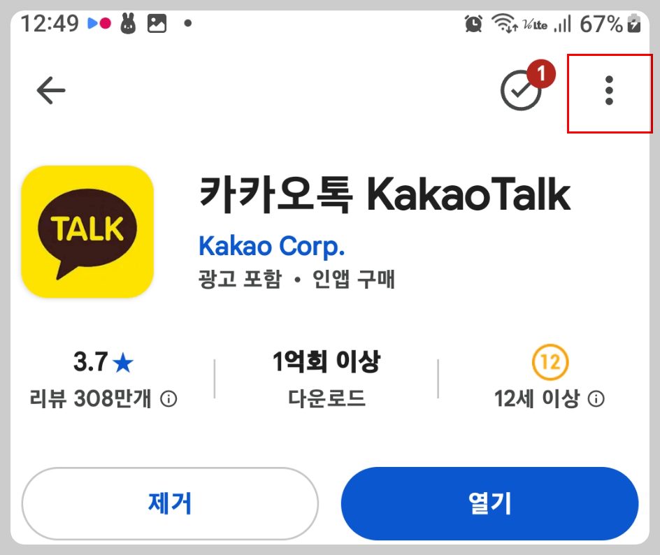 먼저 구글 플레이 스토어를 열고 '카카오톡'을 검색한 후, 앱 설치 화면(상세 페이지)으로 들어갑니다.