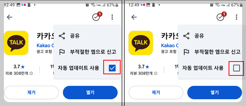 그럼 팝업 메뉴가 왼쪽 화면처럼 나오는데요. '자동 업데이트 사용' 항목의 체크를 해제하시면, 이제 카카오톡은 당신의 허락 없이는 절대 업데이트되지 않는 착한 앱으로 변신합니다.