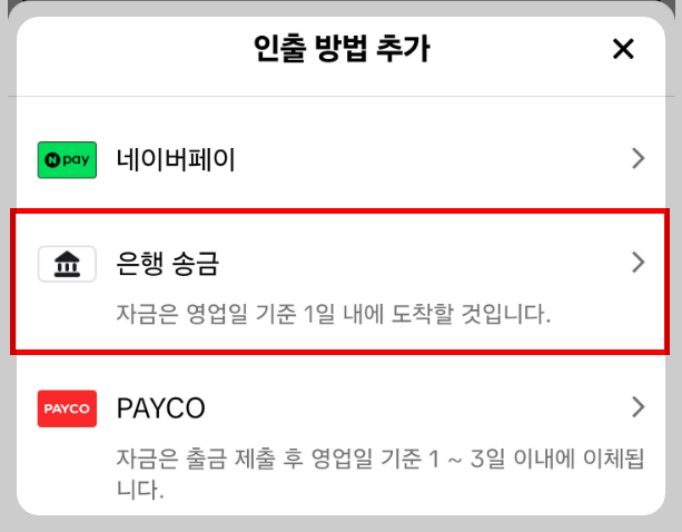 이제 인출 방법 추가에 은행 송금을 누르세요.