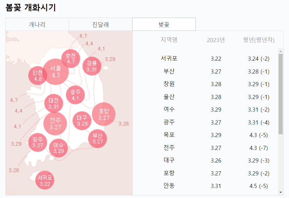 제주도 3.22일을 기점으로 여수 3.29일 서울 4.3일 순으로 벚꽃이 개화되네요.