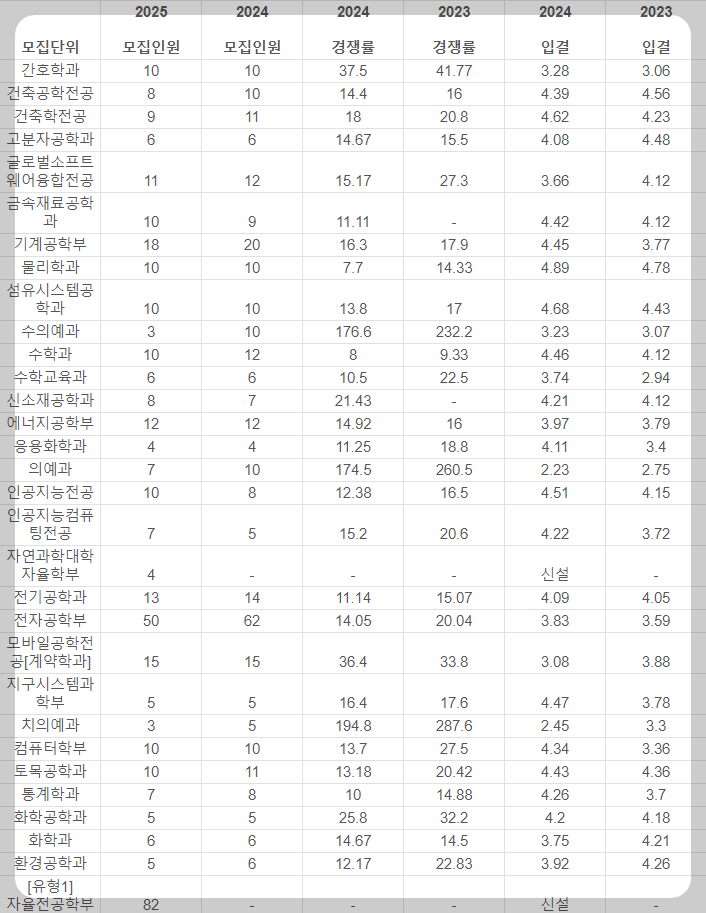 2024학년도 결과를 바탕으로 2025학년도 입결을 예측해 보면 의예과, 치의예과, 수의예과 등 인기 학과의 경쟁은 더욱 심화될 것으로 예상됩니다. 특히, 의학계열 학과는 높은 사회적 관심과 함께 꾸준히 높은 경쟁률을 유지할 것으로 보입니다.