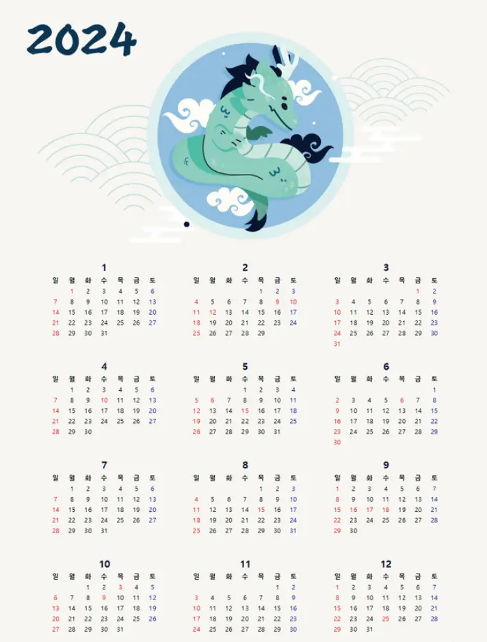 2024년 청용의 기운을 받아 이상하게 운이 좋을거 같은 해네요. 이 글을 보신 분들 모두 대박나는 운이 따르실거에요. 전체 달력과 개별달력이 있으니 클릭해서 한장씩 다운받으세요.