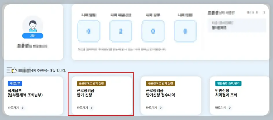 그럼 바로 로그인 하라는 창이 나오는데요. 요즘 간편 인증이 편하니 없다면 이용해 보시고 로그인해주세요. 로그인을 하시면 아래 화면처럼 바뀌는데요. 아래 근로장려금 반기 신청을 누르시면 됩니다.