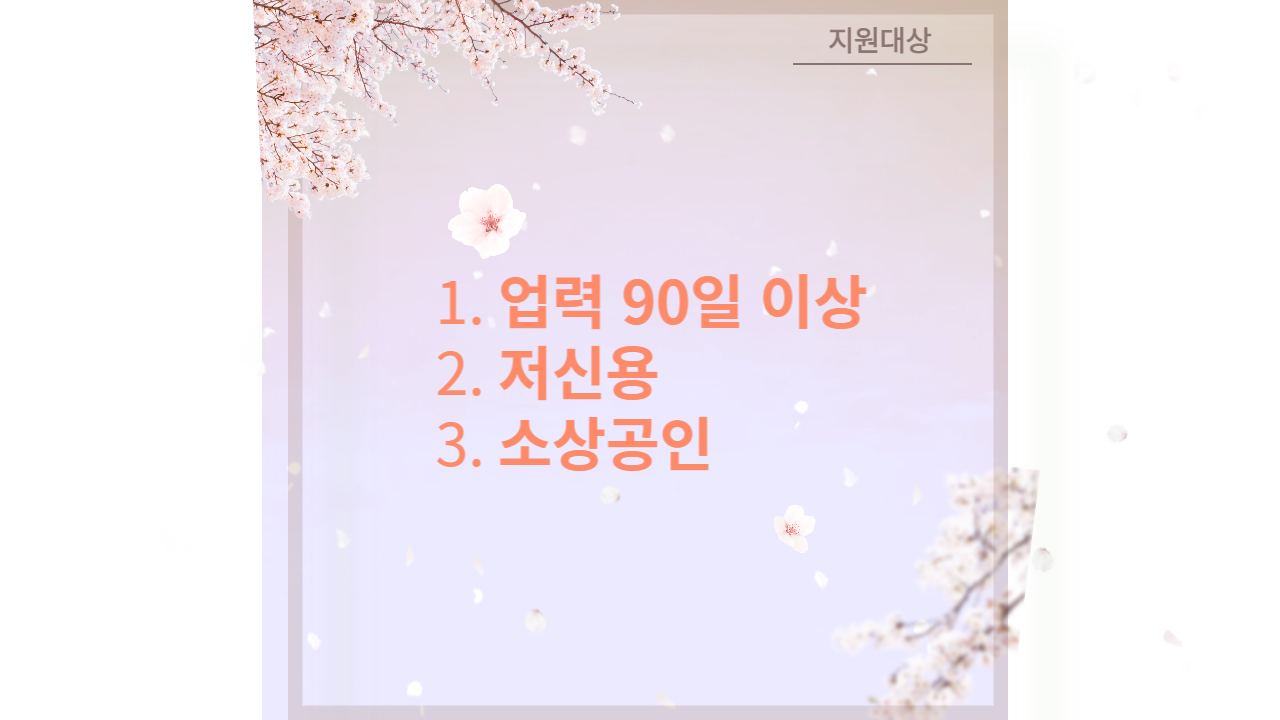 지원대상 : 1. 개업 후 90일 이상 2. 저신용 3. 소상공인