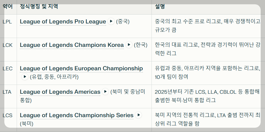 결론적으로, 2025년부터 롤 e스포츠의 주요 지역별 메이저 리그는 아래와 같이 깔끔하게 정리됩니다! LPL (중국) LCK (한국) LEC (유럽, 중동, 아프리카) LTA (북미 및 중남미 통합) LCP (아시아 태평양 통합) 이 다섯 리그의 챔피언들이 모여 세계 최강을 가리는 롤드컵(Worlds)은 더욱 치열하고 흥미진진한 대결을 펼치게 될 것입니다.